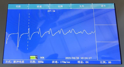 2.使用測距儀脈沖電流法將量程調(diào)制800米范圍,高壓發(fā)生器配合測距儀脈沖電流故障在237.1米處,如圖所示